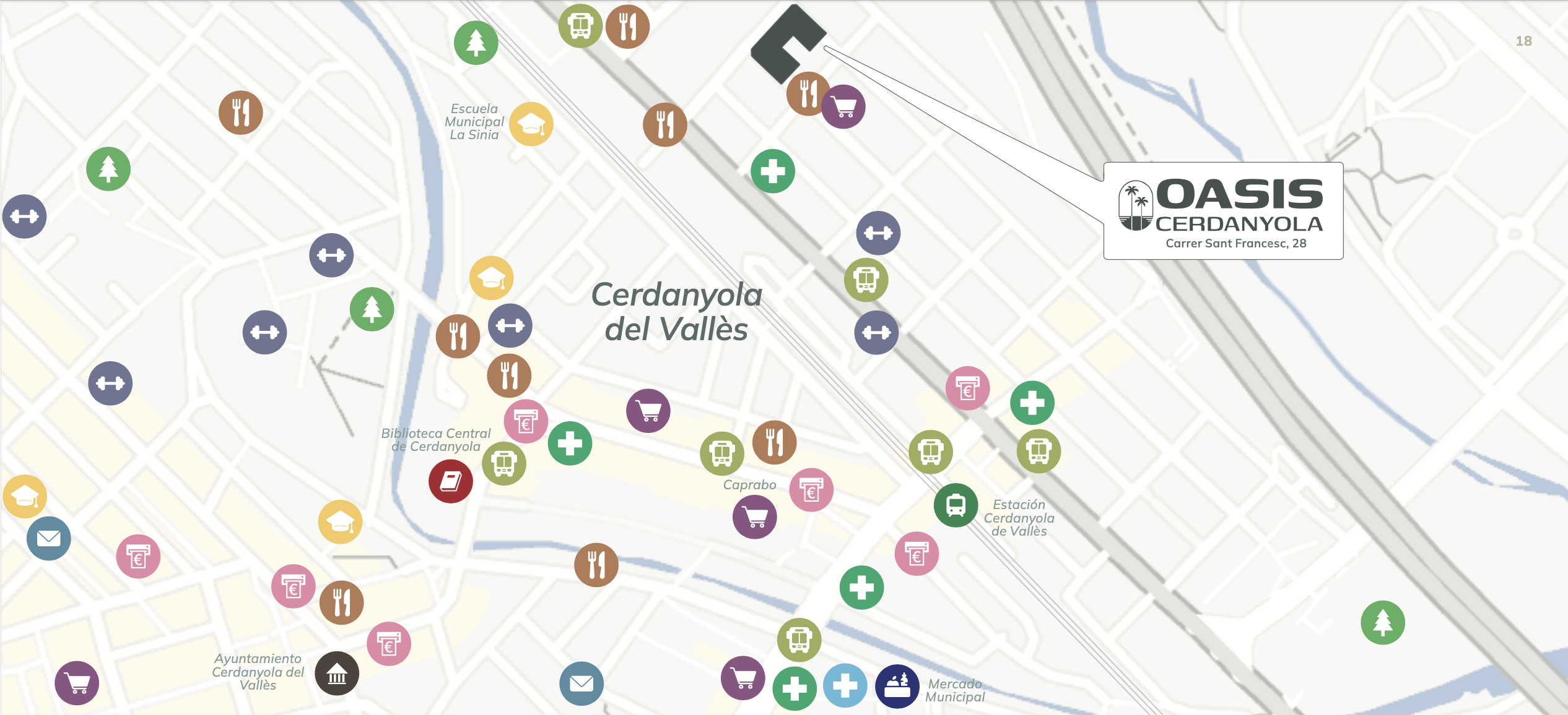Oasis Cerdanyola se encuentra ubicado a 5 minutos a pie del centro de la encantadora localidad de Cerdanyola del Vallès. En esta localidad podrás disfrutar de un ritmo de vida relajado alejado del ajetreo urbano y disponer de una amplia cantidad de servicios a tu disposición: escuelas, comercios, centros deportivos, centros sanitarios y un sinfín más. Además, Oasis Cerdanyola está perfectamente comunicado y se encuentra a 6 minutos a pie de la estación de tren para que puedas acceder fácilmente a otras localidades cercanas como Sant Cugat o Barcelona.