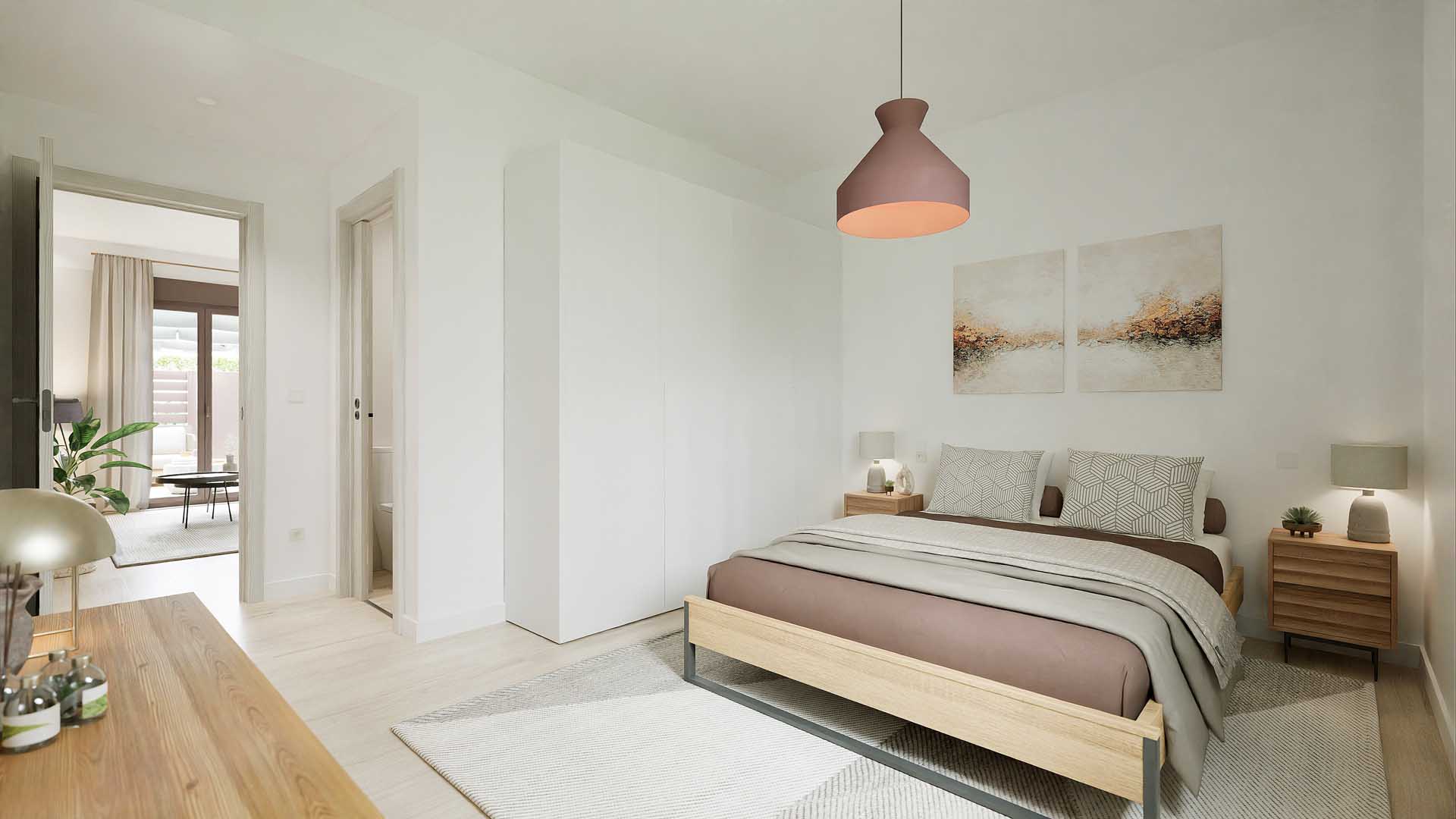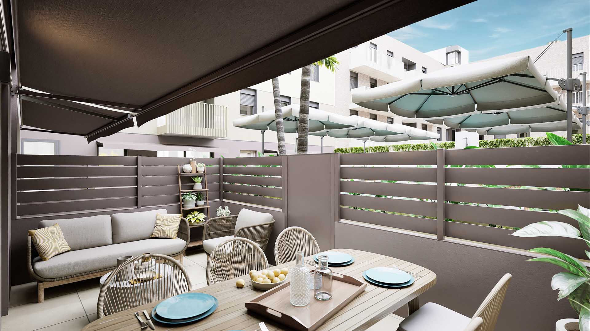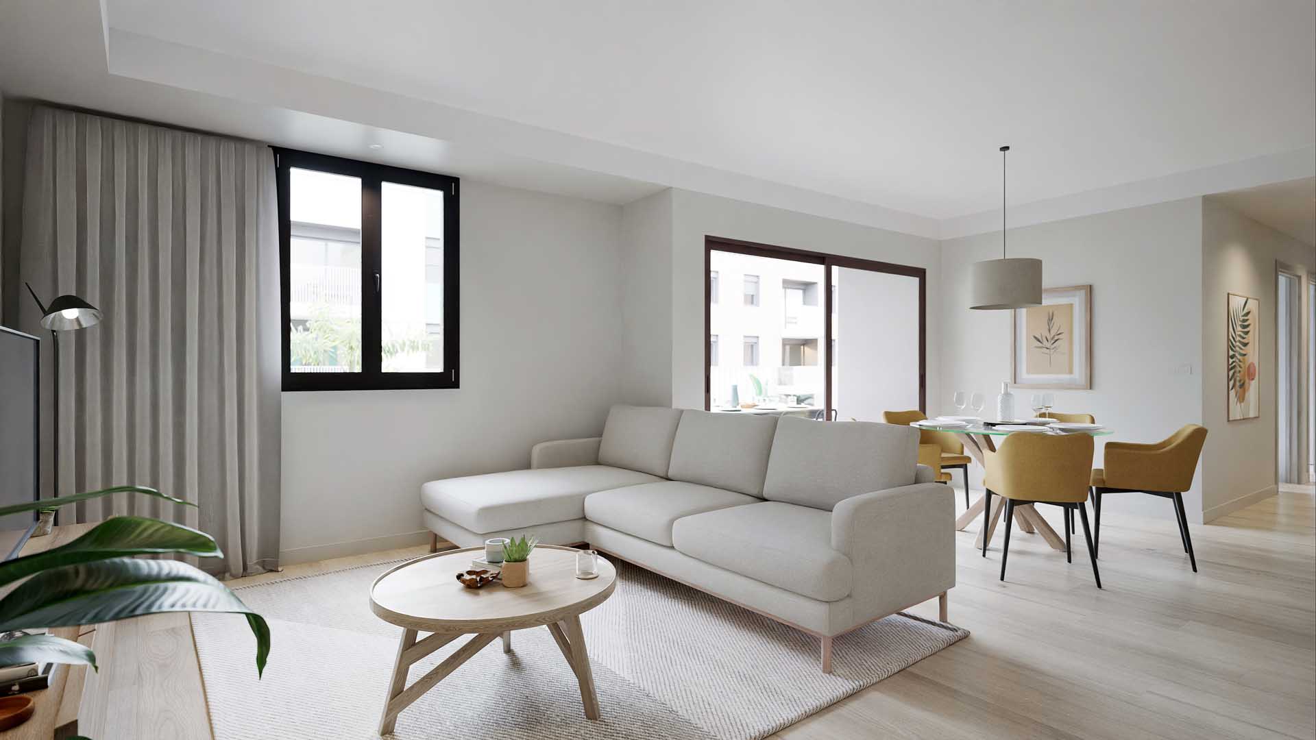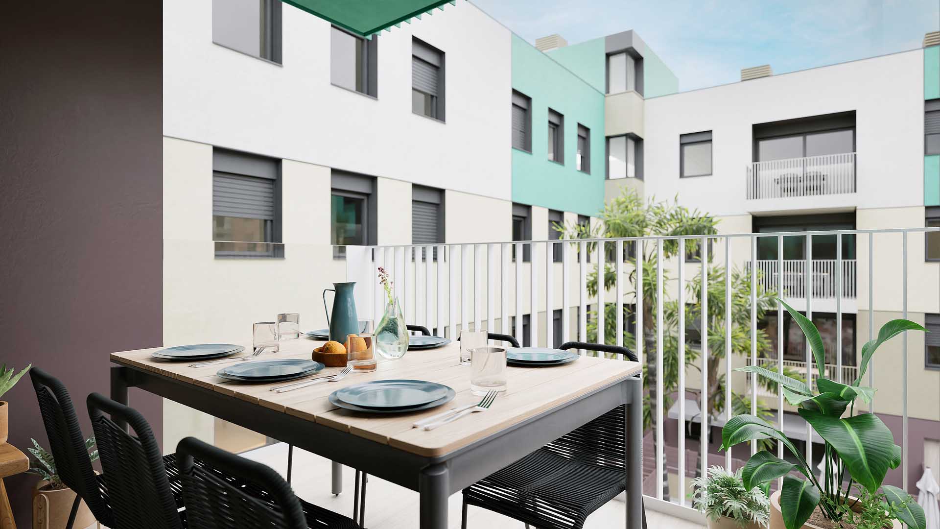 Las viviendas constan de 3 y 4 dormitorios, cocinas abiertas al salón-comedor y dos baños por vivienda. Cada vivienda aprovecha al máximo el espacio con pasillos mínimos y distribuciones eficientes. Las estancias son amplias y destaca la iluminación natural. Todas las viviendas disponen de amplias terrazas, aunque las viviendas de planta baja y áticos ofrecen terrazas aún más amplias con vistas despejadas.