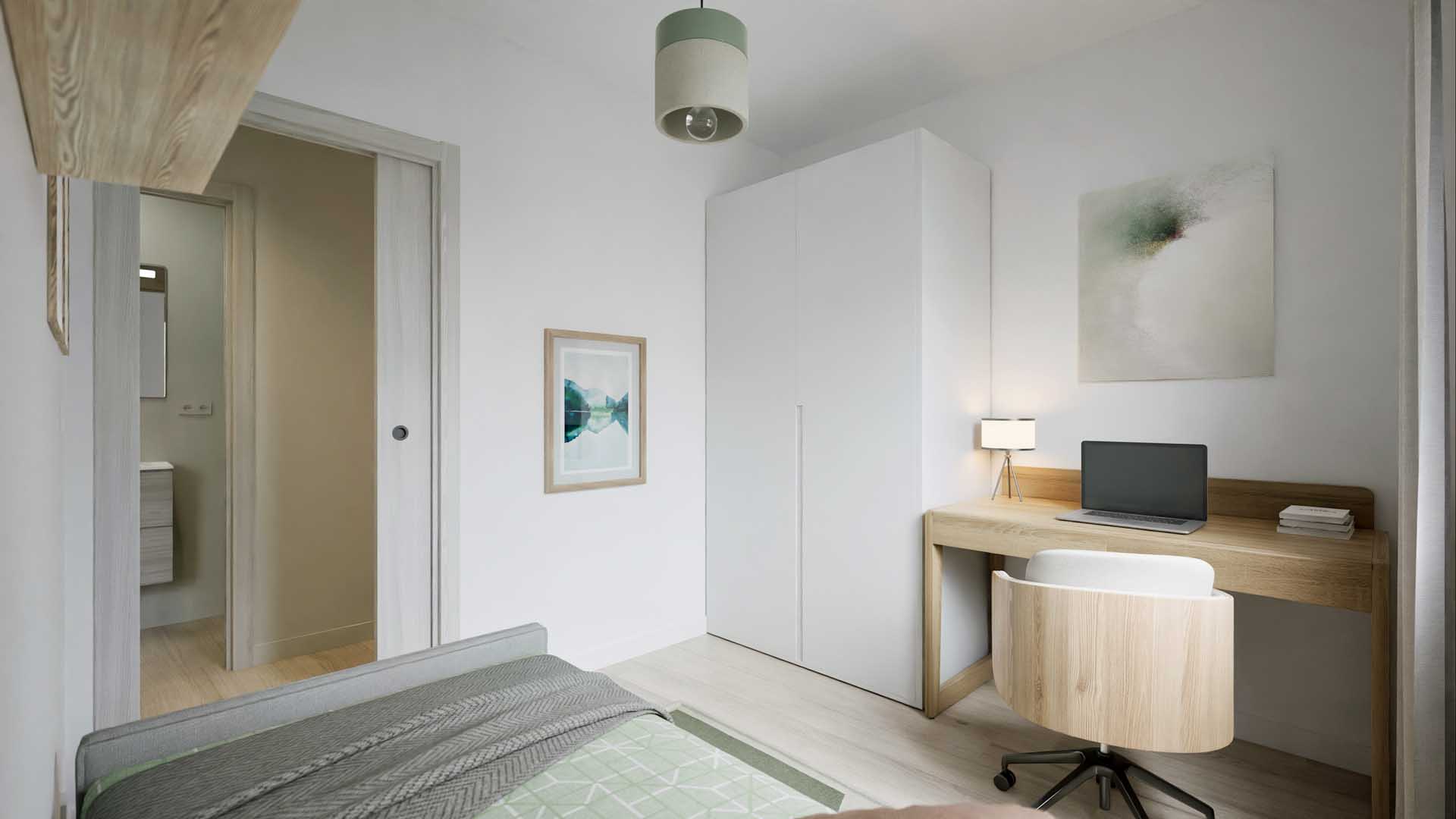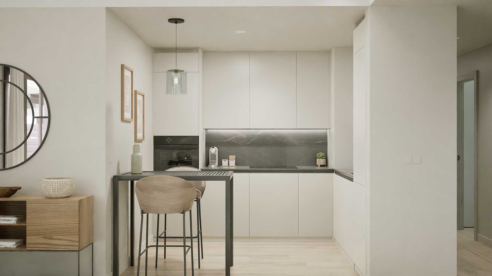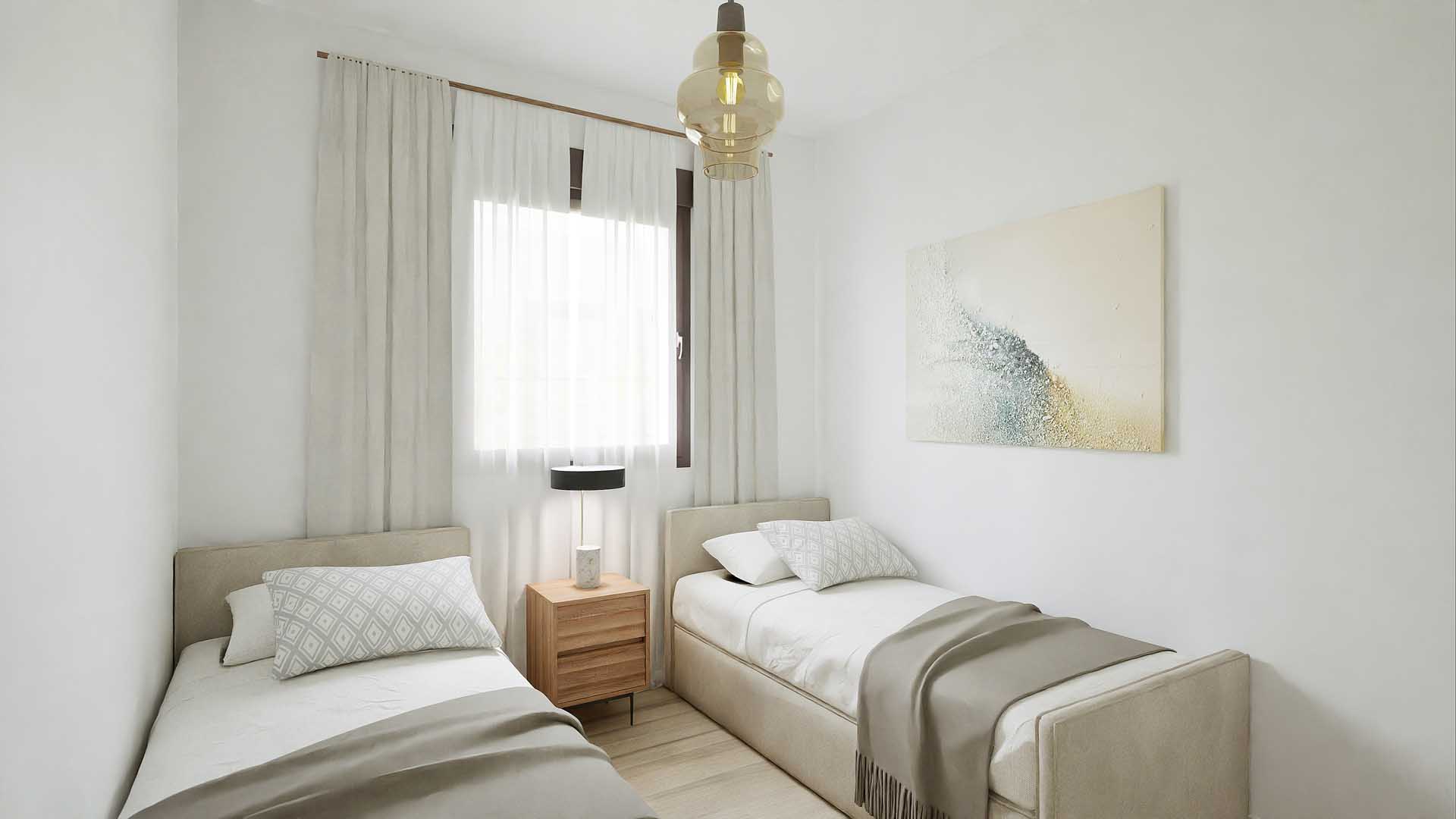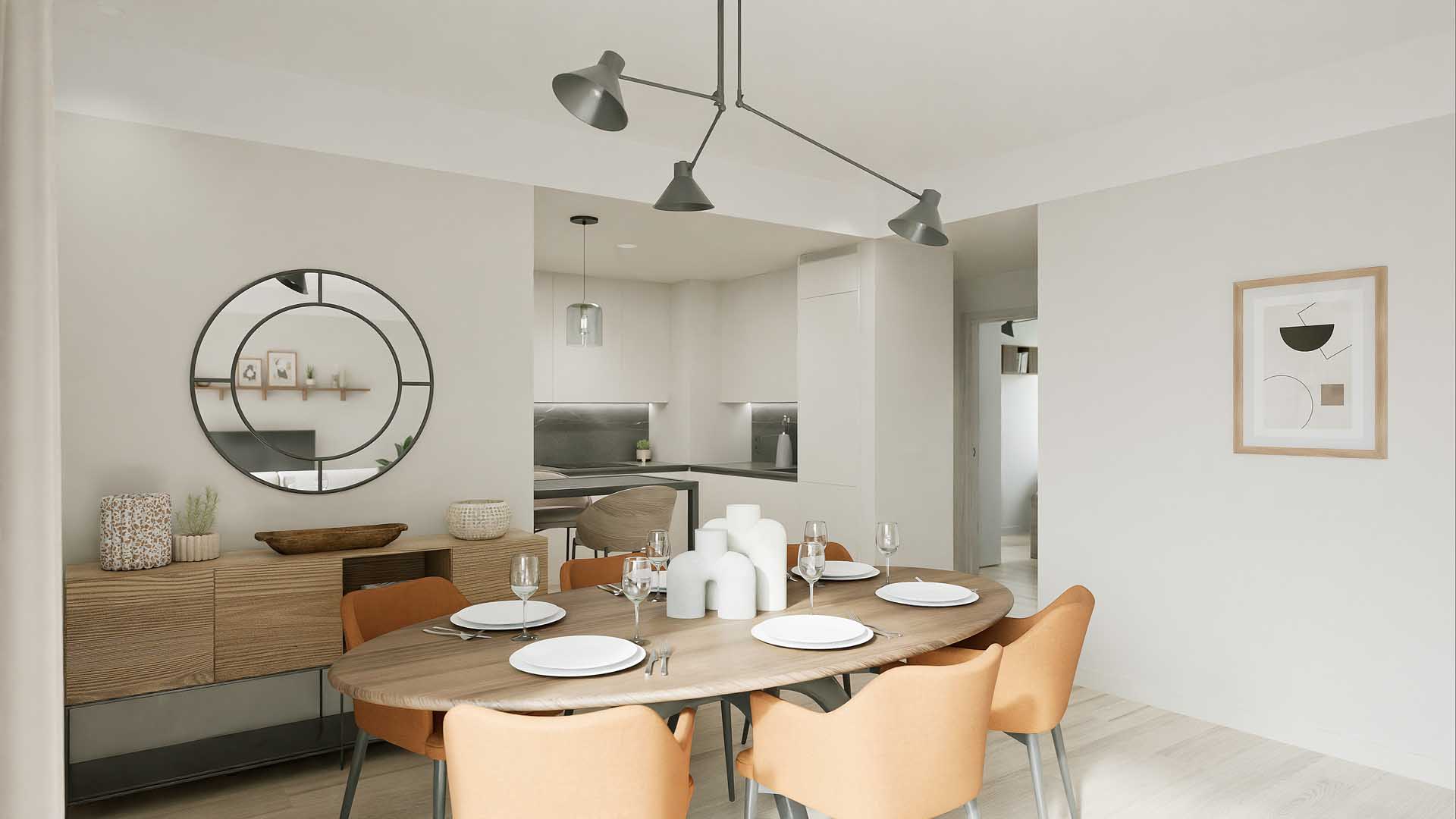 Las viviendas constan de 3 y 4 dormitorios, cocinas abiertas al salón-comedor y dos baños por vivienda. Cada vivienda aprovecha al máximo el espacio con pasillos mínimos y distribuciones eficientes. Las estancias son amplias y destaca la iluminación natural. Todas las viviendas disponen de amplias terrazas, aunque las viviendas de planta baja y áticos ofrecen terrazas aún más amplias con vistas despejadas.