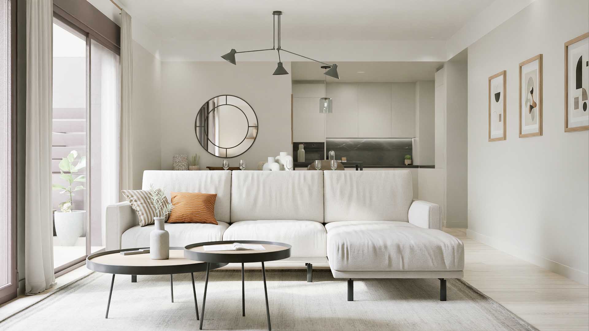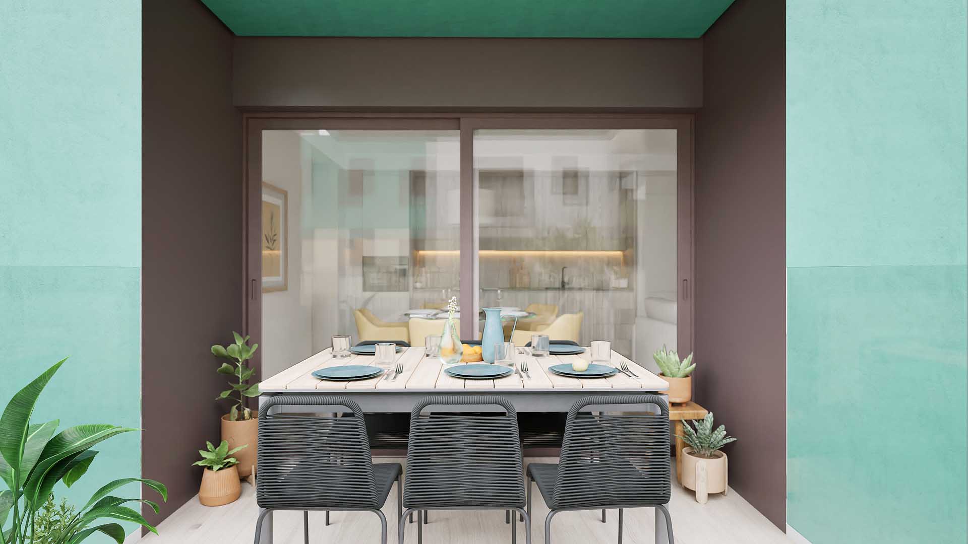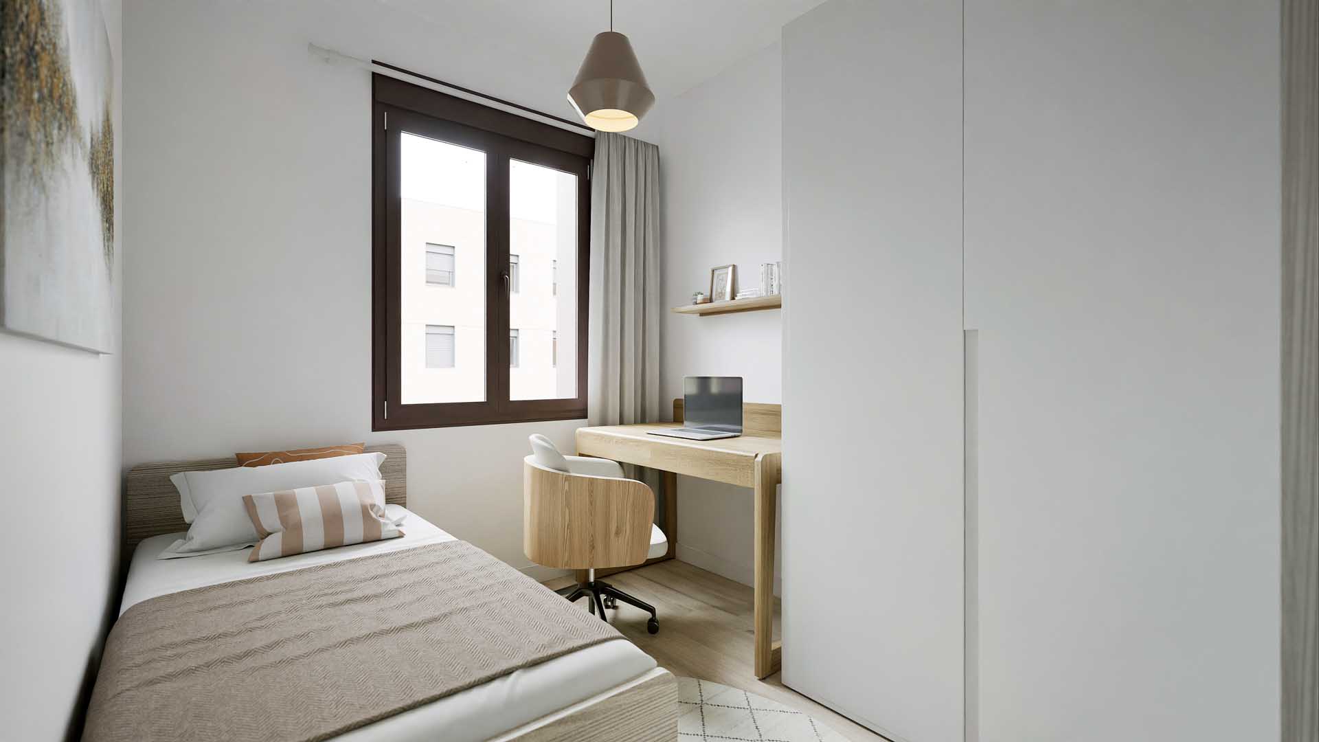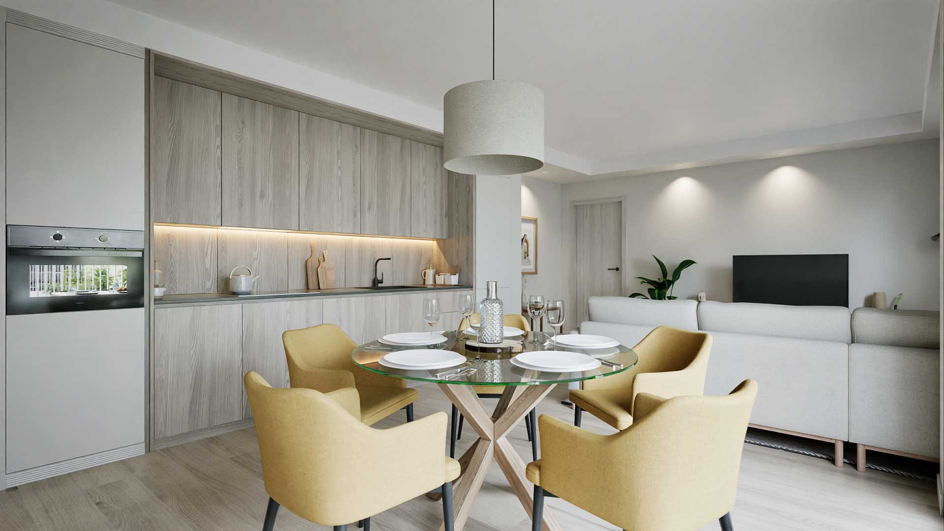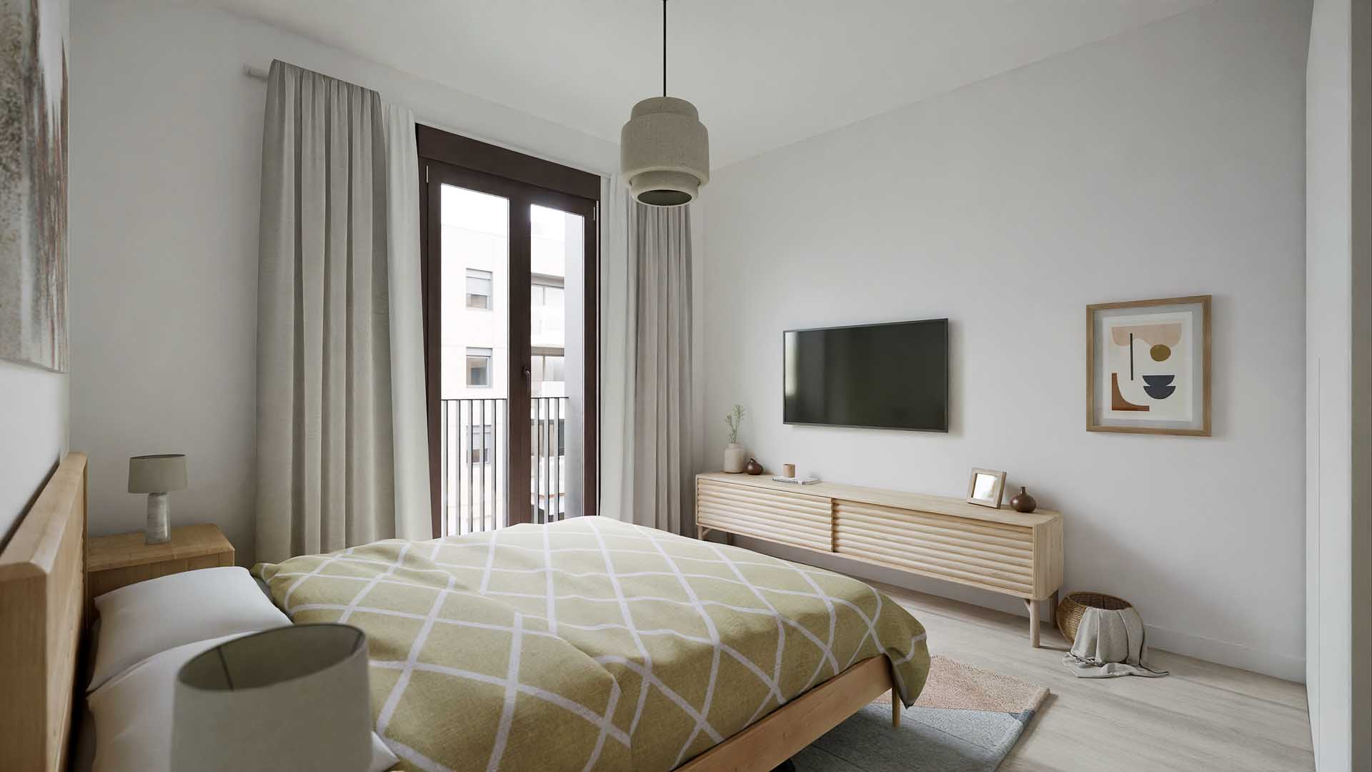 Las viviendas constan de 3 y 4 dormitorios, cocinas abiertas al salón-comedor y dos baños por vivienda. Cada vivienda aprovecha al máximo el espacio con pasillos mínimos y distribuciones eficientes. Las estancias son amplias y destaca la iluminación natural. Todas las viviendas disponen de amplias terrazas, aunque las viviendas de planta baja y áticos ofrecen terrazas aún más amplias con vistas despejadas.